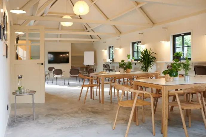 De vergaderruimte is ontworpen met comfort en productiviteit in gedachten. De indeling van het Koetshuis, het meubilair en de flexibele inrichting maken het mogelijk om de ruimte steeds aan te passen aan de behoefte van het moment. Zo kan een groep vrij werken, schakelen tussen werkvormen en optimaal gebruikmaken van de locatie.